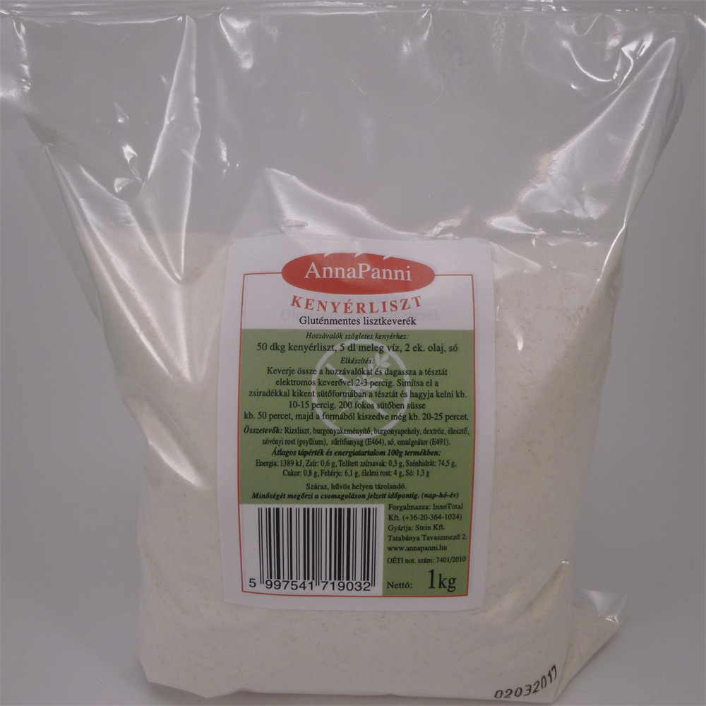 Gluténmentes kenyérliszt. Összetevők: rizsliszt, burgonyakeményítő, burgonyapehely, dextróz, élesztő, növényi rost (psyllium), sűrítőanyag (E464), só, emulgeátor (E491). Átlagos tápérték és energiatartalom (100 g termékben):