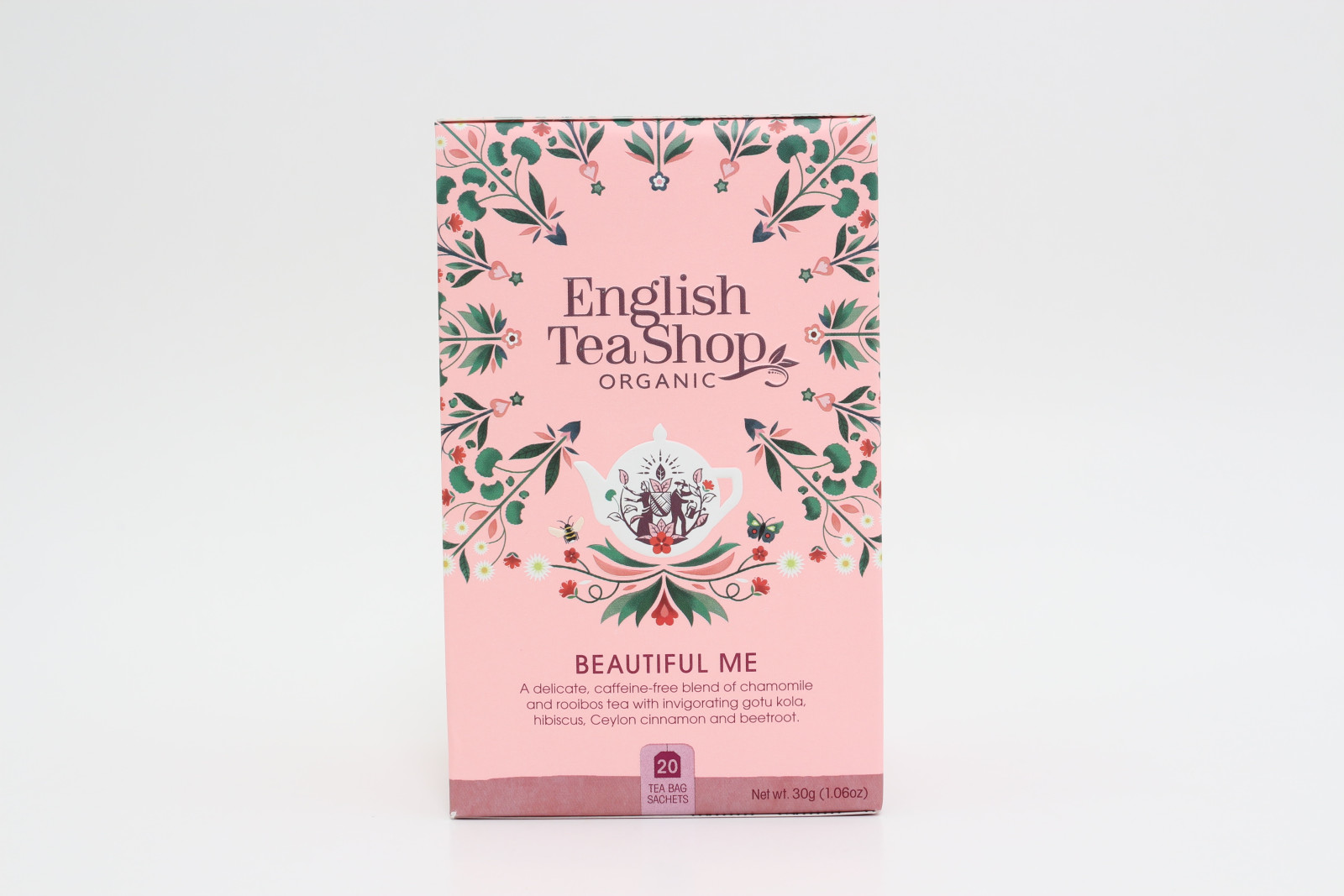 ETS 20 Wellness Beautiful me bio tea. - 20 db. teafilter. Összetevők: kamilla (22.5%)*, köldökfű (21%)*, hibiszkusz (16%)*, fahéj (12%)*, rooibos (9%)*, kakaó (9%)*, narancshéj (5%)*, cékla (3%)*, vörösáfonya lé (2%)*, rózsaszirmok (0.05%)*. *Összetevők: Ellenőrzött ökológiai gazdálkodásból. Gyártó: The English Tea Shop Ltd. London, Anglia. Csomagolva: Sri Lanka. Tárolás: Hűvös száraz helyen. Minőségét megőrzi: lásd a doboz alján. Nettó súly: 30 g.