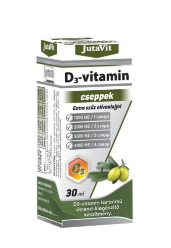 A D-vitamin a zsírban oldódó vitaminok családjába tartozik. A JutaVit D3-vitamin cseppek a D-vitamint extra szűz olívaolajban oldott formában tartalmazza. A D-vitamin hozzájárul a kalcium és a foszfor normál felszívódásához / hasznosulásához, a vér normál kalciumszintjének fenntartásához, az egészséges csontozat és az egészséges izomfunkció fenntartásához. Hozzájárul a normál fogazat fenntartásához és az immunrendszer normál működéséhez. A D-vitamin szerepet játszik a sejtosztódásban.