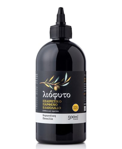 Liofito 100% extraszűz kiváló minőségű olívaolaj praktikus flakonban, csavaros, szabályozható kupakkal. A Koroneiki és Pikilia fajtájú olajbogyókból kizárólag mechanikai préseléssel nyert olívaolaj ajánlott hidegen salátákra, főzéshez, vagy sütéshez füstpont (180-200 Celsius-fok*) alatti hőmérsékleten (Nemzetközi Olívaolaj Szövetség ajánlása szerint*)