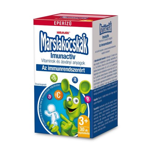 WALMARK MARSLAKO RÁGÓTABLETTA EPER IMUNACTIV 30X: Hatóanyagai (12 vitamin és ásványi anyagok) hozzájárulnak az egészség megőrzéséhez. Többek között a C-, D-vitamin és a cink szerepet játszik az immunrendszer megfelelő működésében, a szervezet ellenállóképességének fenntartásában. A B-vitaminok az idegrendszer kiegyensúlyozott működésében vesznek részt, csökkentik a fáradtságot, a B5-vitamin a szellemi teljesítményhez is hozzájárul. A D-vitamin ezenkívül részt vesz a gyermekek csontfejlődésében, a jód pedig a növekedésükben játszik szerepet. Az apró, narancsízű, szájban oldódó tablettákat, melyek fogbarát édesítőszert (xilitet) tartalmaznak, 3 éves vagy annál idősebb gyermekek számára fejlesztették ki, de felnőttek is fogyaszthatják.