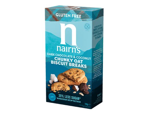 Nairns gluténmentes teljeskiőrlésű 57% rostdús zabkeksz étcsoki&kókusz 160 g