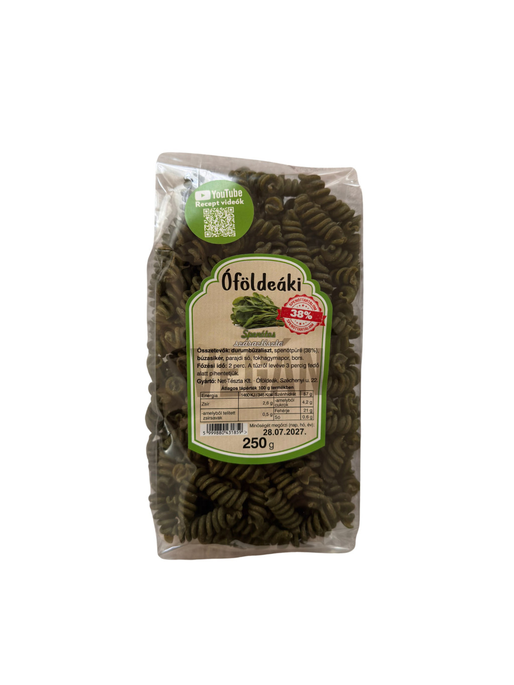 Összetevők: durumbúzaliszt, spenótpüré, búzasikér, parajdi só, fokhagymapor, bors