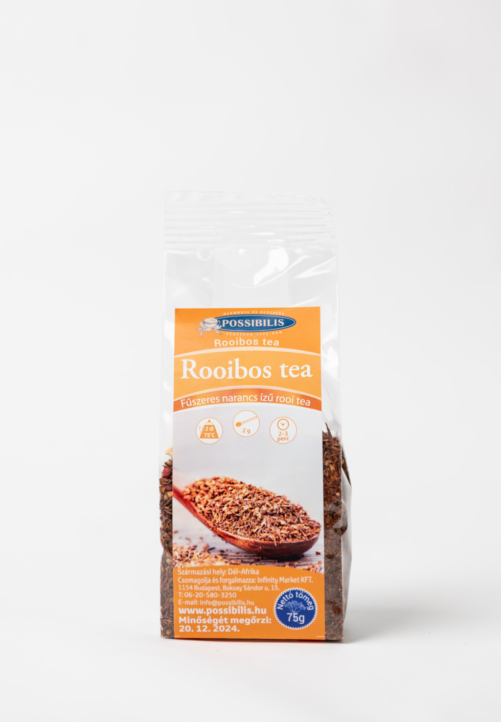 POSSIBILIS ROOIBOS TEA FŰSZERES NARANCS ÍZZEL. Narancs ízű rooibos tea. A Rooibos tea az egyik legkeresettebb és legértékesebb teakülönlegesség világszerte. Dél-Afrika Cape tartományában honos "vörösbokor" hajtásaiból készül. Koffeint nem tartalmaz, ezért kitűnő folyadékpótló gyerekeknek, felnőtteknek egyaránt. Jellegzetes, frissítő íze a fekete teáénál édesebb. Mélyvörös színű.