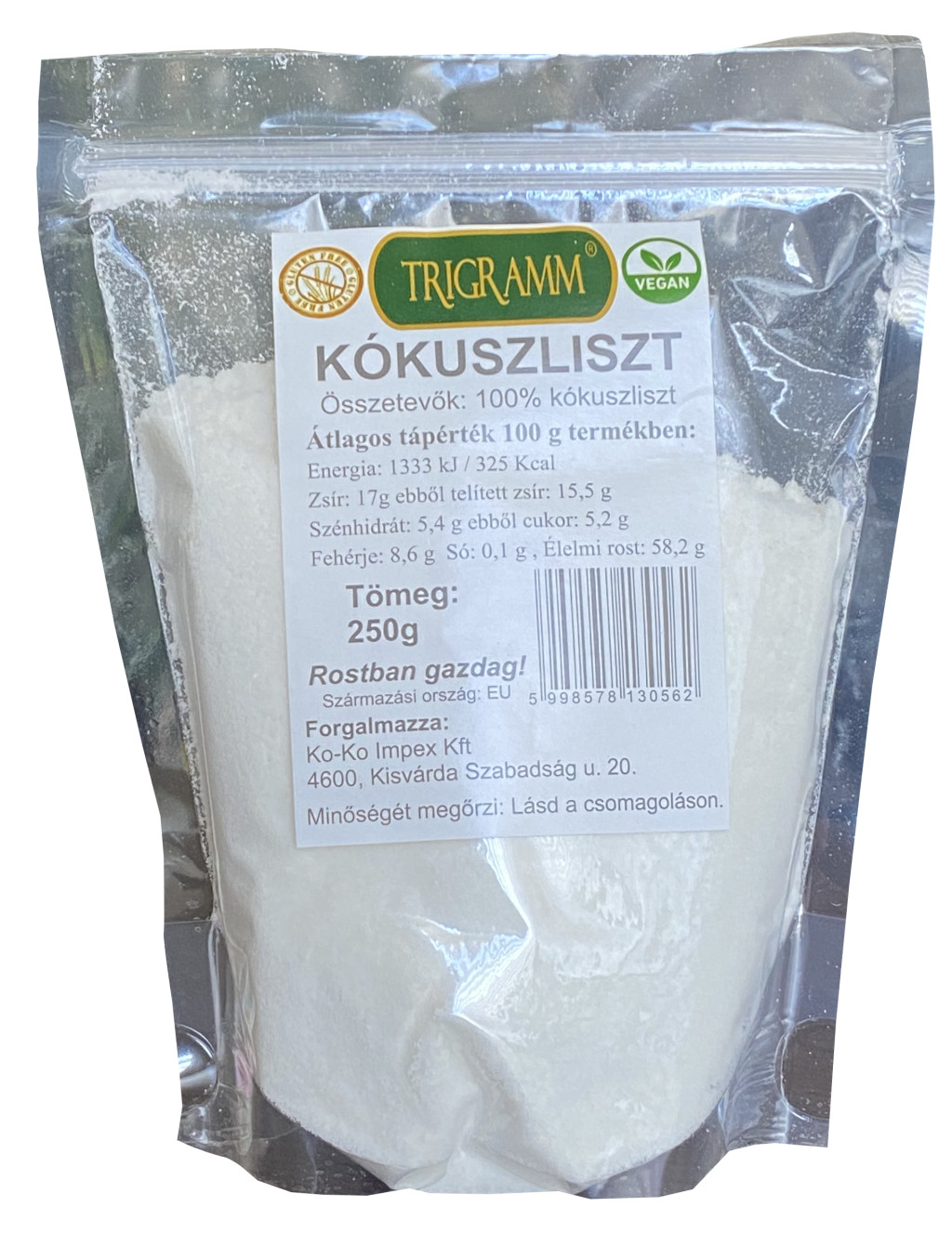 100 % Kókuszliszt. Alacsony zsírtartalmú, finomszemcsés kókuszliszt, amely tökéletesen alkalmas édes, sós sütemények, illetve kenyerek készítéséhez. Gluténmentes termék, hozzáadott adalékanyagot, cukrot, ízfokozót, színezéket nem tartalmaz. Rostban gazdag termék!